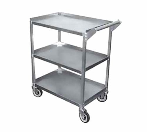 Kelmax Utility Cart, 3-tier, open design, shelves three sides up, one down, shelf size 15.5" x 24", single handle, all welded aluminum frame, 5" polyurethane swivel stem casters, 650 lb. load capacity, NSF