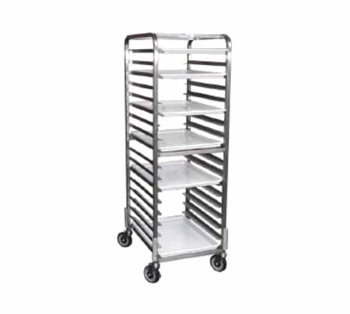 Kelmax Pan Rack, mobile, full height, (18) 18" x 26" pan capacity, slides on 3" centers, end loading, open sides, welded square tubular stainless steel construction, 5" swivel stem casters, NSF