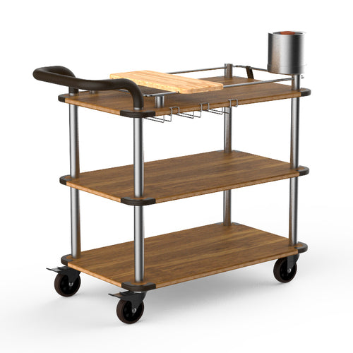 Mogogo Buffet Solutions Roll'n Mixology Service Cart, 41-1/2" x 21" x 40-1/2"H, multi-purpose, (3) high density bamboo finish shelves, push handle, stainless steel frame, brushed stainless steel finish, heavy duty casters, knockdown