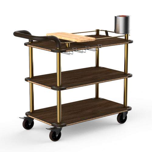 Mogogo Buffet Solutions Roll'n Mixology Service Cart, 41-1/2" x 21" x 40-1/2"H, multi-purpose, (3) Bengali mango wood BHP shelves, push handle, stainless steel frame, brushed brass finish, heavy duty casters, knockdown