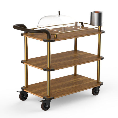 Mogogo Buffet Solutions Roll'n Cheese & Wine Cart, 41-1/2" x 21" x 40"H, multi-purpose, (3) high density bamboo finish shelves, with a border, cheese tray, leather towel hanger, & champagne bucket, push handle, stainless steel frame, brushed brass finish,