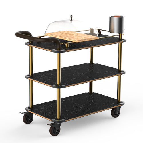 Mogogo Buffet Solutions Roll'n Cheese & Wine Cart, 41-1/2" x 21" x 40"H, multi-purpose, (3) Nero Marquina marble BHP shelves, with a border, cheese tray, leather towel hanger, & champagne bucket, push handle, stainless steel frame, brushed brass finish, h