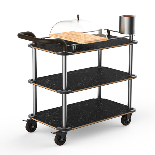 Mogogo Buffet Solutions Roll'n Cheese & Wine Cart, 41-1/2" x 21" x 40"H, multi-purpose, (3) Nero Marquina marble BHP shelves, with a border, cheese tray, leather towel hanger, & champagne bucket, push handle, stainless steel frame, brushed stainless steel