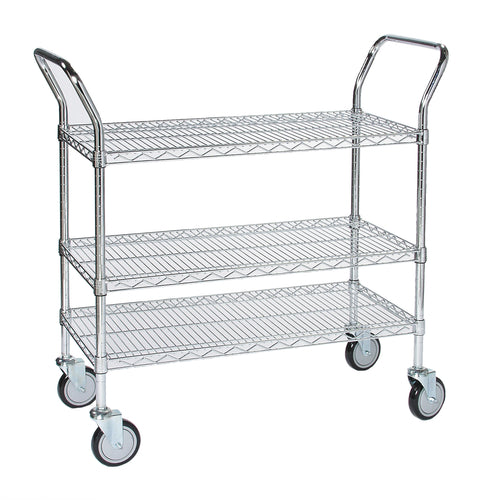 Utility Cart, 3-tier, 36"W x 24"D x 38"H, (3) wire shelves, includes (2) chrome U-shaped push handles, 1200 lbs. maximum capacity, PolySeal clear epoxy finish, 5" swivel casters