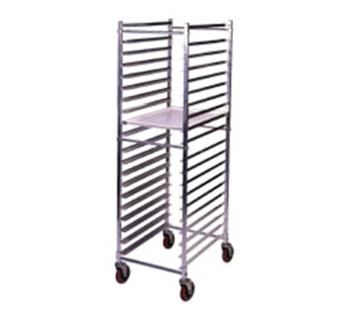 Mobile Pan Rack, full height, 21"W x 26"D x 69"H, end loading, open sides, (20) 18" x 26" pans capacity, 3" OC spacing, all welded angle pan supports., aluminum construction, cross braces. 5" polyurethane swivel stem casters, NSF, shipped KD