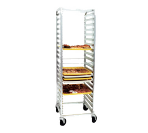 Mobile Pan Rack, full height, open sides, with slides for (36) 18"x26" pans, welded channel aluminum frame, end loading, 5" swivel stem casters, NSF