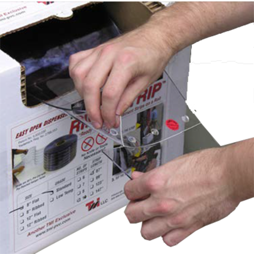 Rip-A-Strip® PVC Roll: 16” wide x .145” thick x custom length strips (total length: 100’), low temperature grade (temperature range: -20°F to 140°F), kiss-cut & punched, clear, ribbed, flexible