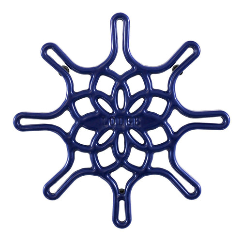 Trivet, 8" dia., skillet design, with metal hanger, rubber feet, dishwasher safe (hand wash recommended), porcelain enameled cast iron, indigo