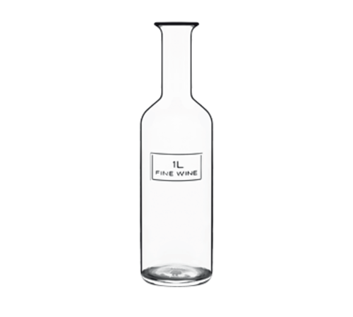 Wine Serving Bottle, 34 oz. (35.25 oz. brimful), 3-1/2" dia. x 12-1/2"H, embossed with CE gauge mark reflecting 1 liter capacity, safe edge rim, glass, clear, Optima® by Luigi Bormioli