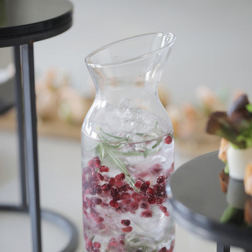 Carafe, .8 liter (27 oz.), 3-3/5" dia. x 10-7/10"H, tapered neck, angled top, soda lime glass