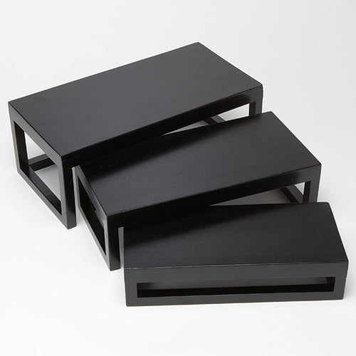 Riser Set, 3-piece, includes (1) each: 16"L x 8"W x 6"H, 14-1/2"L x 7"W x 4-1/2"H & 13"L x 5-3/4"W x 3"H, rectangular, wood, black