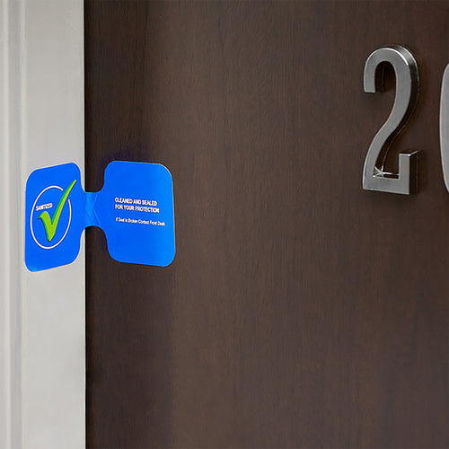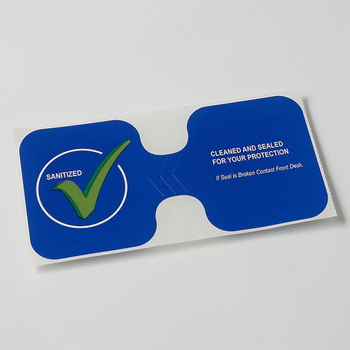 Sanitized Door Seal Label, 3" x 6", "Sanitized", "Cleaned and Sealed for your Protection, blue (500 labels per roll)