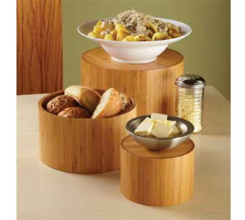 Display Riser Set, set of 3, round, various sizes, can be used as risers and bowls, bamboo, includes 1 of each: 6" dia. x 4"H, 9" dia., x 5"H, and 11" dia. x 6"H, (hand wash only)