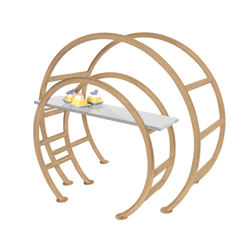 Circular Tabletop Display, small, 3 level, 23-1/2"W x 9-1/2"D x 21"H, modern design, double sided service, includes (3) acrylic shelves, heavy duty 18/10 stainless steel, XYLO bronze finish with Anti-Microbial 24/7 germ-free surface coating (made to order, non-returnable)