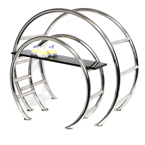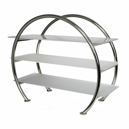 Circular Tabletop Display, large, 3 level, 33"W x 13-5/8"D x 27-1/2"H, modern design, double sided service, includes (3) glass shelves, heavy duty 18/10 stainless steel
