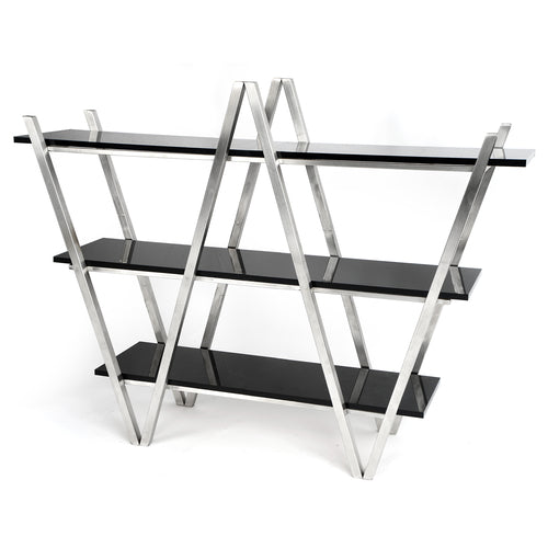 "W" Tabletop Display, 3 level, 35"W x 11"D x 29-1/2"H, stand alone, double sided service, includes (3) black acrylic shelves, brushed finish, heavy duty 18/10 stainless steel