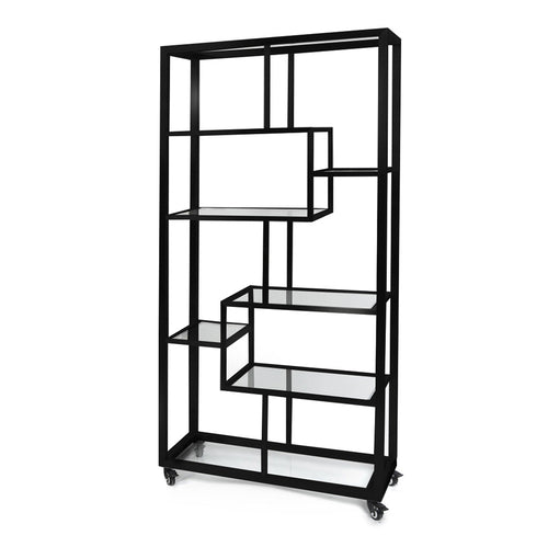 Square Mobile Back Bar Display, 35-1/2”W x 14”D x 73”H, with (7) tempered glass shelves, locking caster wheels, heavy duty stainless steel, black finish