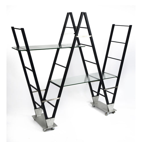 "W" Mobile Back Bar Display, 85"W x 19"D x 68"H, modern design, 5-tier display, includes (10) glass shelves: (2) 15-3/16" x 42-3/4" shelves, (2) 15-3/16" x 40" shelves, (2) 15-3/16" x 38-1/8" shelves, (2) 15-3/16" x 34-1/2" shelves, (2) 15-3/16" x 31-5/8" shelves, folds away for storage, heavy duty locking casters, 18/10 stainless steel construction, black finish