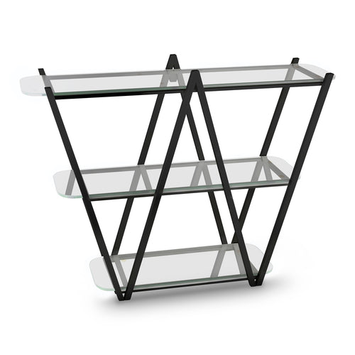"W" Tabletop Display, 3 level, 35"W x 11"D x 29-1/2"H, stand alone, double sided service, includes (3) glass shelves, brushed finish, heavy duty 18/10 stainless steel, XYLO black finish with Anti-Microbial 24/7 germ-free surface coating (made to order, non-returnable)