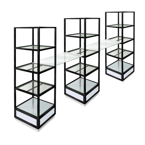 Q-Bik Mobile Buffet Display System, for indoor/outdoor use, 4-tier, 19-3/4"W x 19-3/4"D x 78-3/4"H, large, includes (4) removable glass shelves, hidden heavy duty locking casters, 18/10 stainless steel, XYLO black finish with Anti-Microbial 24/7 germ-free surface coating (made to order, non-returnable)