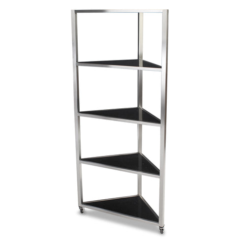Euclid Series Rolling Display (Elite), 36”L x 19-1/2"W x 78-1/2"H, (4) triangular Trend Glass or Trend Stone shelves, 1-1/2" and 1" square tube frames, stainless steel, brushed finish, (3) all swivel casters with 3" wheels (all with brakes)