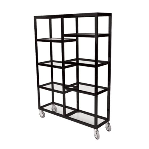 Classic Rolling Display (Elite), 48”L x 14"W x 68-1/2”H, adjustable shelving, (8) rectangular clear tempered glass shelves, 3/4" x 1-1/2" rectangular brass frame, solid brass, polished finish, 5" gray wheels, in brass plated casters (2 with brakes)