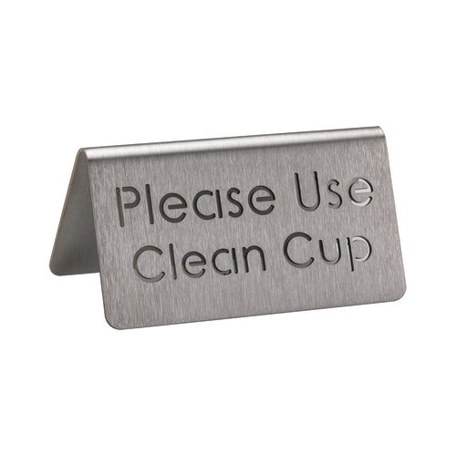 Beverage ID Tent, "Please Use Clean Cup", 1-1/2"H x 3"W, laser-cut, dishwasher safe (hand washing is recommended), 18/8 stainless steel, brushed finish, Made in USA (Priced per each, packed 6 each per case)