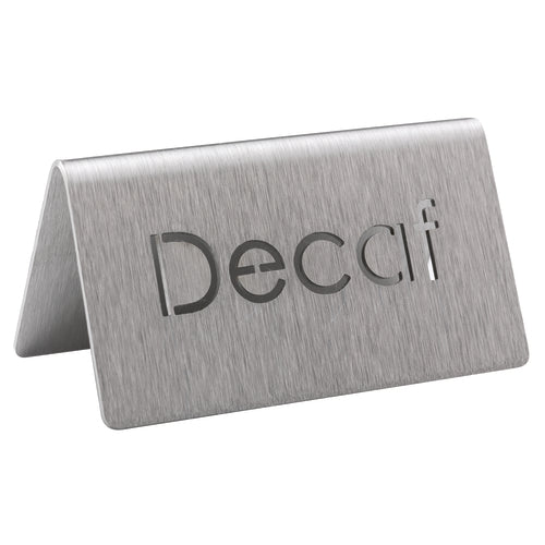 Beverage ID Tent, "Decaf", 1-1/2"H x 3"W, laser-cut, dishwasher safe (hand washing is recommended), 18/8 stainless steel, brushed finish, Made in USA (Priced per each, packed 6 each per case)