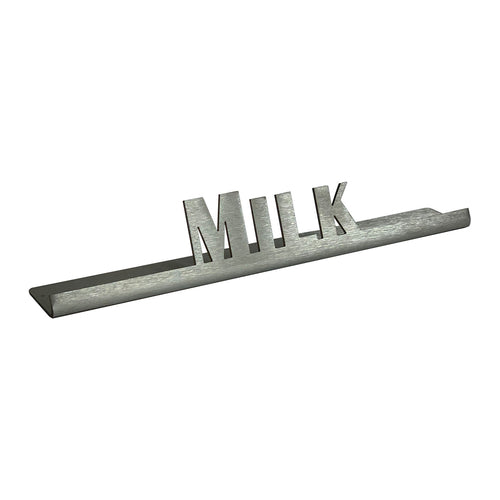 Beverage ID Sign, "Milk", 1"H x 6-1/2"W, laser-cut, dishwasher safe (hand washing is recommended), 18/8 stainless steel, brushed finish, Made in USA (Priced per each, packed 6 each per case)