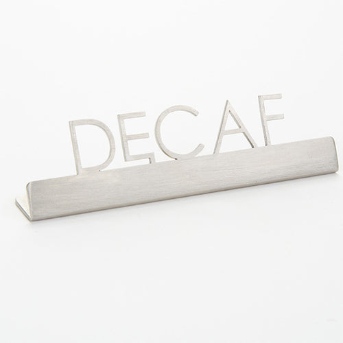 Sign, "decaf", 5"L x 3/4"W x 1-1/2"H, stainless steel