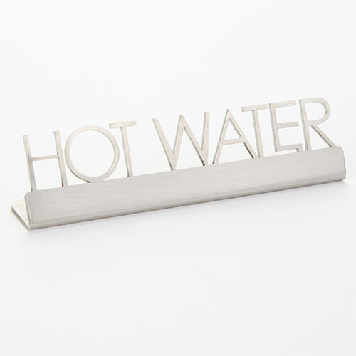 Sign, "hot water", 5"L x 3/4"W x 1-1/2"H, stainless steel
