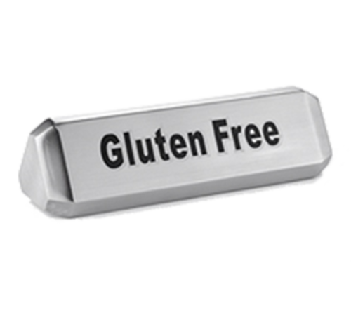 Sign, 4-3/4"L x 1-1/2"W x 1-3/8"H, triangular, (3) sided identifies: Vegan, Vegetarian, Gluten free, stainless steel