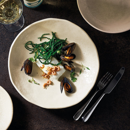 Mineral Collection Plate, 8" dia. x 1-3/4"H, round, matte texture with glossy flecks, chip and stain resistant, dishwasher safe, melamine, parchment crackle, Dalebrook