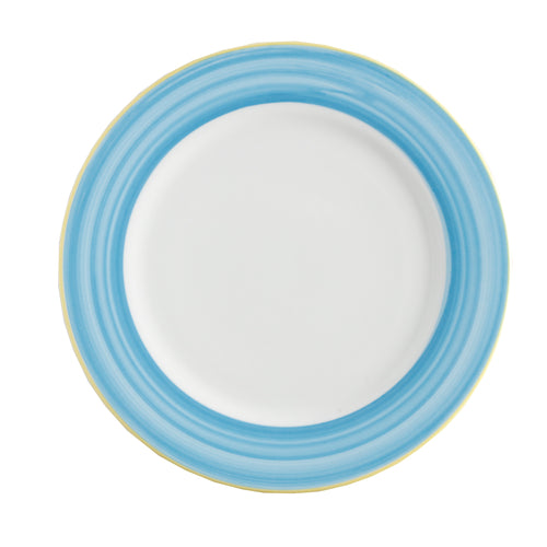 Plate, 12-1/4" dia., round, rolled edge, scratch/chip resistant, microwave, dishwasher & oven safe up to 380°F, porcelain, yellow edge, Corona, Calypso, Blue (Stocked Item)