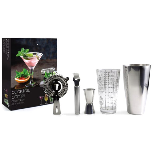 Danesco® Cocktail Bar Set, 5-piece, includes (1) stainless steel shaker, (1) glass shaker printed with (4) cocktail recipes, (1) strainer, (1) double jigger, (1) zester (gift boxed with "Utensil Library") (2 sets minimum order) (NET)