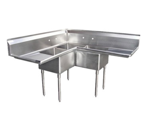 Corner Sink, 3-compartment, 18" left & right boards, (3) 18"W x 18" front-to-back x 12" deep, 18/304 stainless steel bowls, stainless steel legs with adjustable feet with adjustable feet, NSF