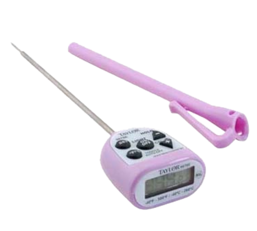 Thermometer, digital, allergen safe, 5-1/8" probe, 3/8" x 1"LCD display, -40° to 500° F (-40° to 260° C) temperature range, 3v battery included, case, water proof, dishwasher safe, purple, FDA approved, NSF