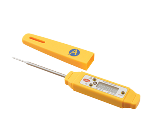 Thermometer, digital, 2-3/4" probe, 5-7/8" overall length, -40° to 392° F (-40° to 200° C) temperature range, 1.5v battery included, antimicrobial sheath, waterproof, dishwasher safe, yellow, plastic, stainless steel probe, NSF