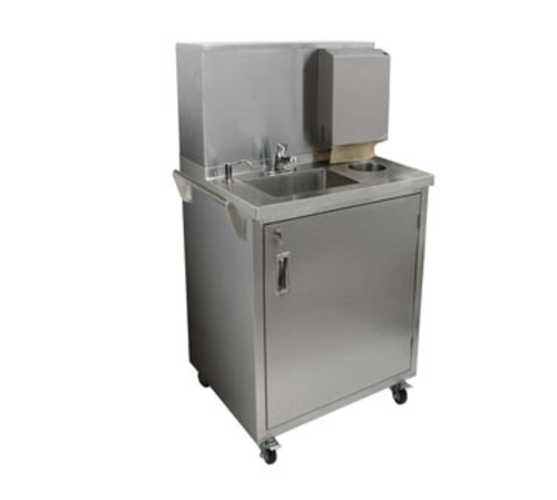Mobile Hand Sink, self-contained, 30-1/4"W x 24-3/4"D x 53-1/2"H, hot & cold water, removable (1) 20 gallon fresh water tank & (1) 21 gallon waste water tank, soap dispenser, towel dispenser, handle, stainless steel construction, 5" swivel casters with brakes, ETL