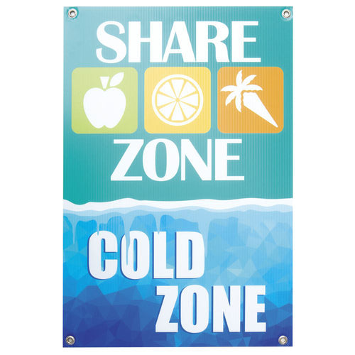 Sign, "Share Zone / Cold Zone", for Wire Share Cart #97214, 18-3/4"L x 28"H, silver grommets for hanging, corrugated plastic, multi-colored