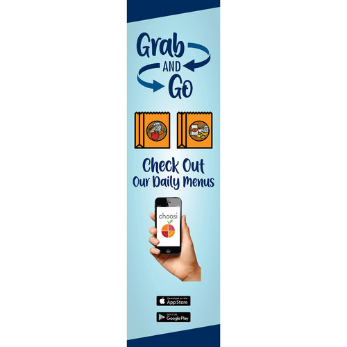 Panel, "grab & go; check out our daily menus", 59-1/2"L x 16"W, double sided, 4mm corrugated plastic, blue (fits 75848) (2 each per pack)