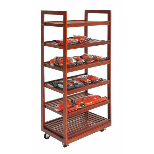 Bakery Cart, 6-shelf, 31" x 20"x 68"H, rectangular, flat shelves, price track molding, (4) 5" dia. non-marking plate casters (locking), wood, mahogany finish