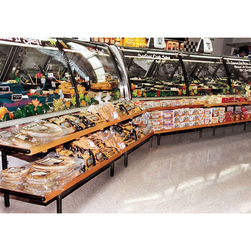 Deli Bunk, 48" x 17" x 19"H overall, 48"L x 11-3/4"W top shelf, 48"L x 17"W bottom shelf, rectangular, tilt-top, 30° angled bottom shelf, black steel frame, wood shelves with oak finish