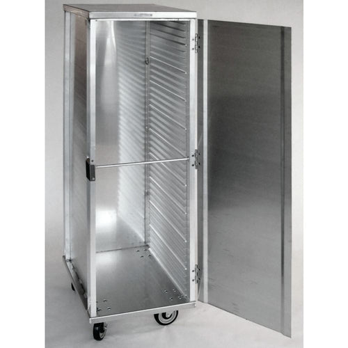 Pan Rack, 40-pan, full-height, enclosed, 27" x 21" x 68"H, (40) 18" x 26" pan capacity, 1-1/2" pan spacing, hinged door, (4) 5" dia. polyurethane swivel casters, aluminum
