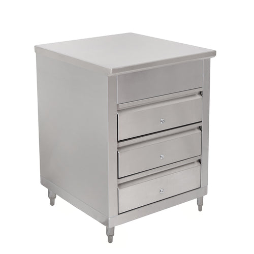 Drawer Cabinet, 24"W x 30"D x 35-3/4"H, 14/300 stainless steel flat top, with Stallion Safety Edge front, 18/400 stainless steel wrap, (3) tier 15" x 20" drawers with locks, 6" stainless steel legs with adjustable bullet feet, NSF