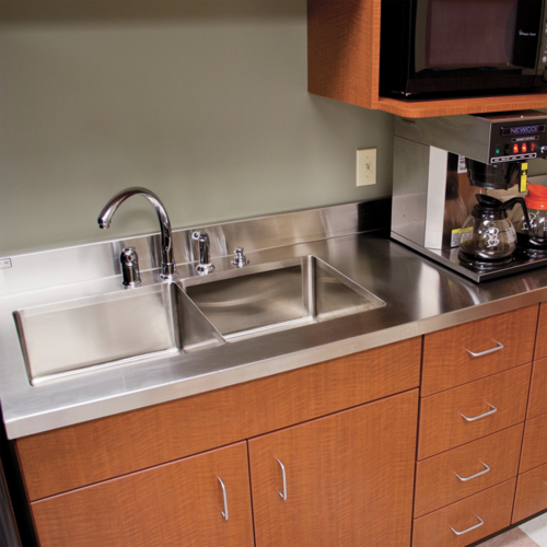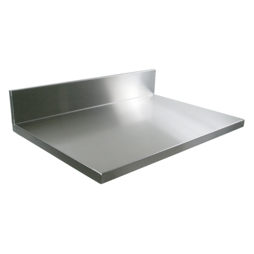 Countertop, 96"W x 25"D x 1-1/2" thick with 6" boxed backsplash, 16/300 stainless steel with #4 polish, 1-3/8" thick premium particle board with melamine backing underlayment, NSF