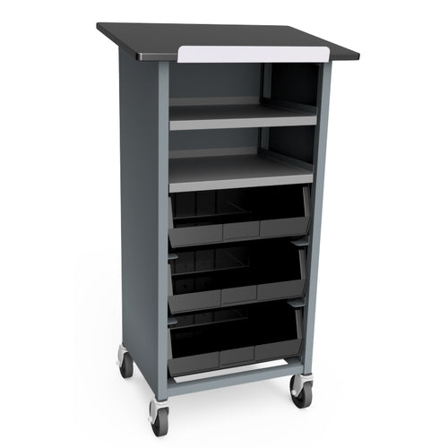 Merchandising Stand, mobile, slanted laminated top with pencil stop, (2) removable shelves, (3) plastic bins, (4) 4" hard rubber swivel casters, grey