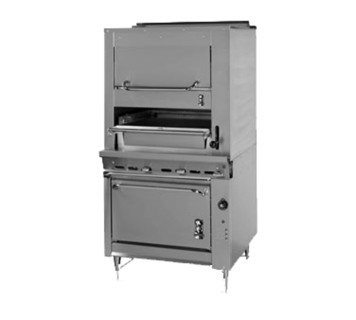 Legend™ Radiglo Broiler, 36" heavy duty range match, gas, infrared deck type, adjustable broiler grid, standard oven base & upper warming oven, 4" flue riser, stainless steel front, black sides & top, 6" adjustable stainless steel legs, 124,000 BTU, NSF, CSA, CE