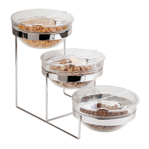 Bowl Stand Set, 3-tier, 9-1/2” x 24” x 13-7/8”H overall, includes (3) 3 qt. 9" glass bowls, with hinged plastic lids, chrome stand, Paderno, Buffet (Special Order Item)