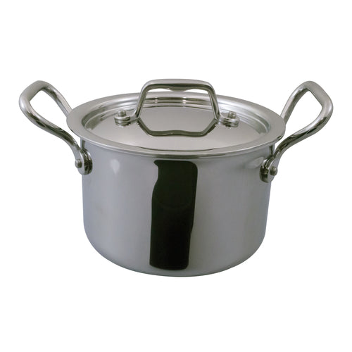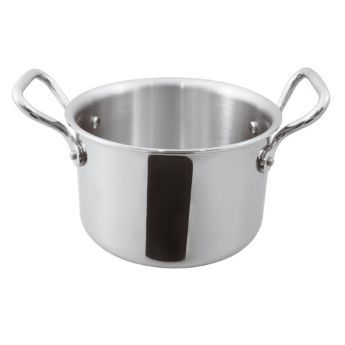 Mini Sauce Pot, 32 oz., 4-3/4" dia. x 3-1/8"H, without lid, induction ready, riveted handles, dishwasher safe, tri-ply stainless steel & aluminum, mirror polished finish, Paderno, Mini S/S Cookware
